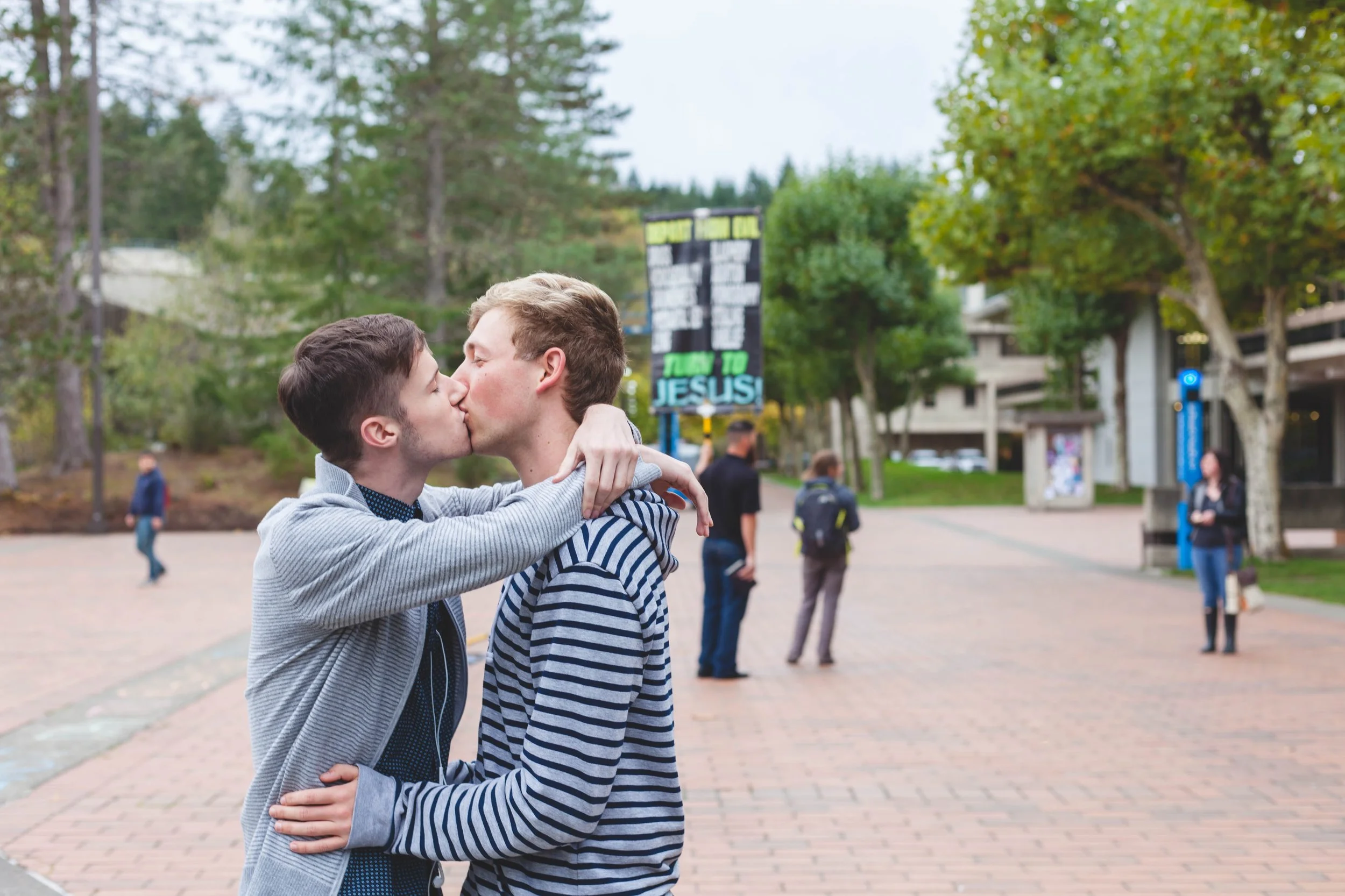 Couple kissing by protester yelling hate speech.